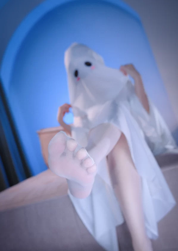 先看第一张图,她裹着那身幽灵布,黑圆眼睛配上粉腮红,像个刚偷吃完糖的小调皮鬼。最绝的是伸出来的小脚丫,裹着透明袜子,又乖又俏,仿佛在悄悄说 “别发现我哦”,这反差感谁扛得住,心都要化了!