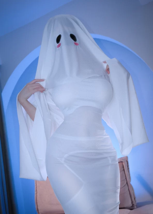 再看第二张,她把幽灵布拉开些,露出里头的造型,曲线感绝了!原本萌萌的幽灵突然多了份小性感,却又不失可爱,就像幽灵界的时尚 icon,把简单的 “床单幽灵装” 穿出了独一份的风格,让人忍不住感叹:原来幽灵也能这么有魅力!
